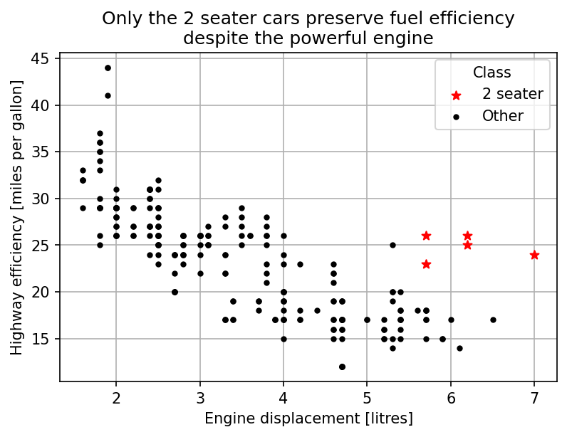 plt.legend([handle_2seater, handle_other], ['2 seater', 'Other'], title='Class')